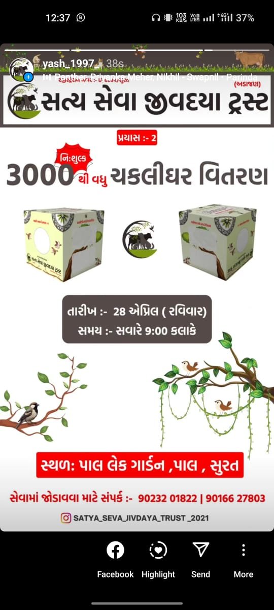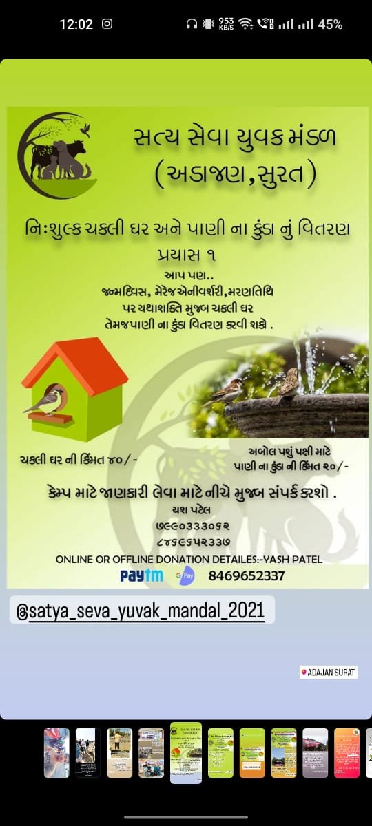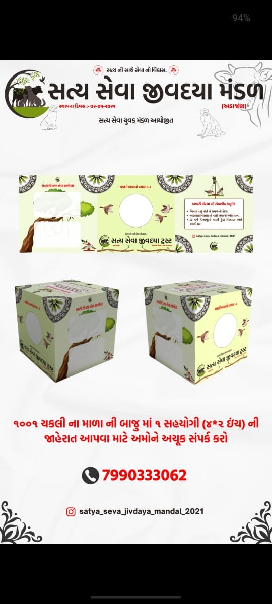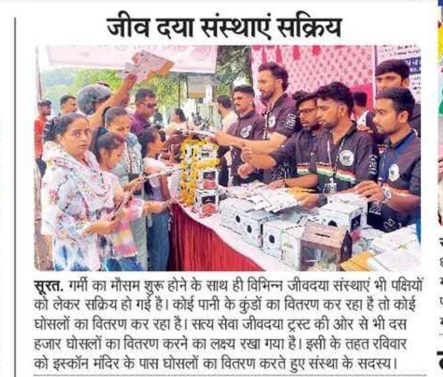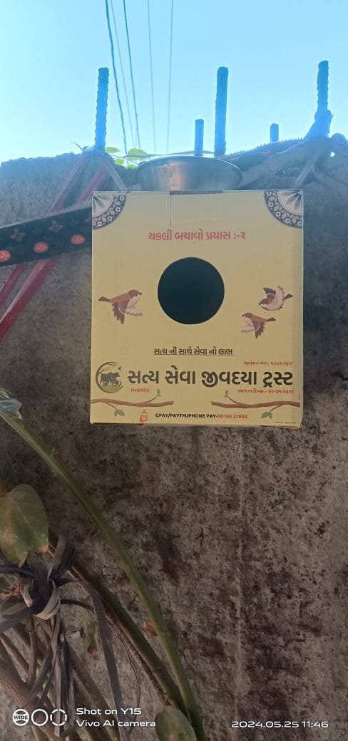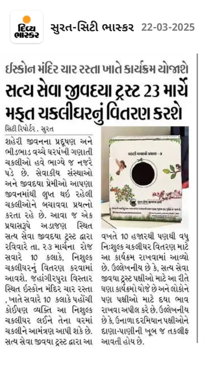સત્યસેવા જીવદયા ટ્રસ્ટ દ્વારા આયોજિત “ચકલી ઘર વિતરણ કેમ્પ” એ પક્ષી સેવા અને સંરક્ષણ માટેનું મહત્વપૂર્ણ અભિયાન છે, જેમાં ટ્રસ્ટ ઘરની આસપાસ પક્ષીઓ, ખાસ કરીને ચકલી (સ્પેરો) માટે અનુકૂળ ઘર (અસ્થાયી નિવાસ) વિતરિત કરે છે. આ કેમ્પનો હેતુ શહેરો અને ગામોમાં પક્ષીઓના નિવાસ માટે યોગ્ય સ્થાન પૂરું પાડવું છે, જેમાં આ નાનાં પક્ષીઓ આપત્તિથી બચી શકે અને તેમના નૈસર્ગિક વાસસ્થાનોને સાચવી શકાય.