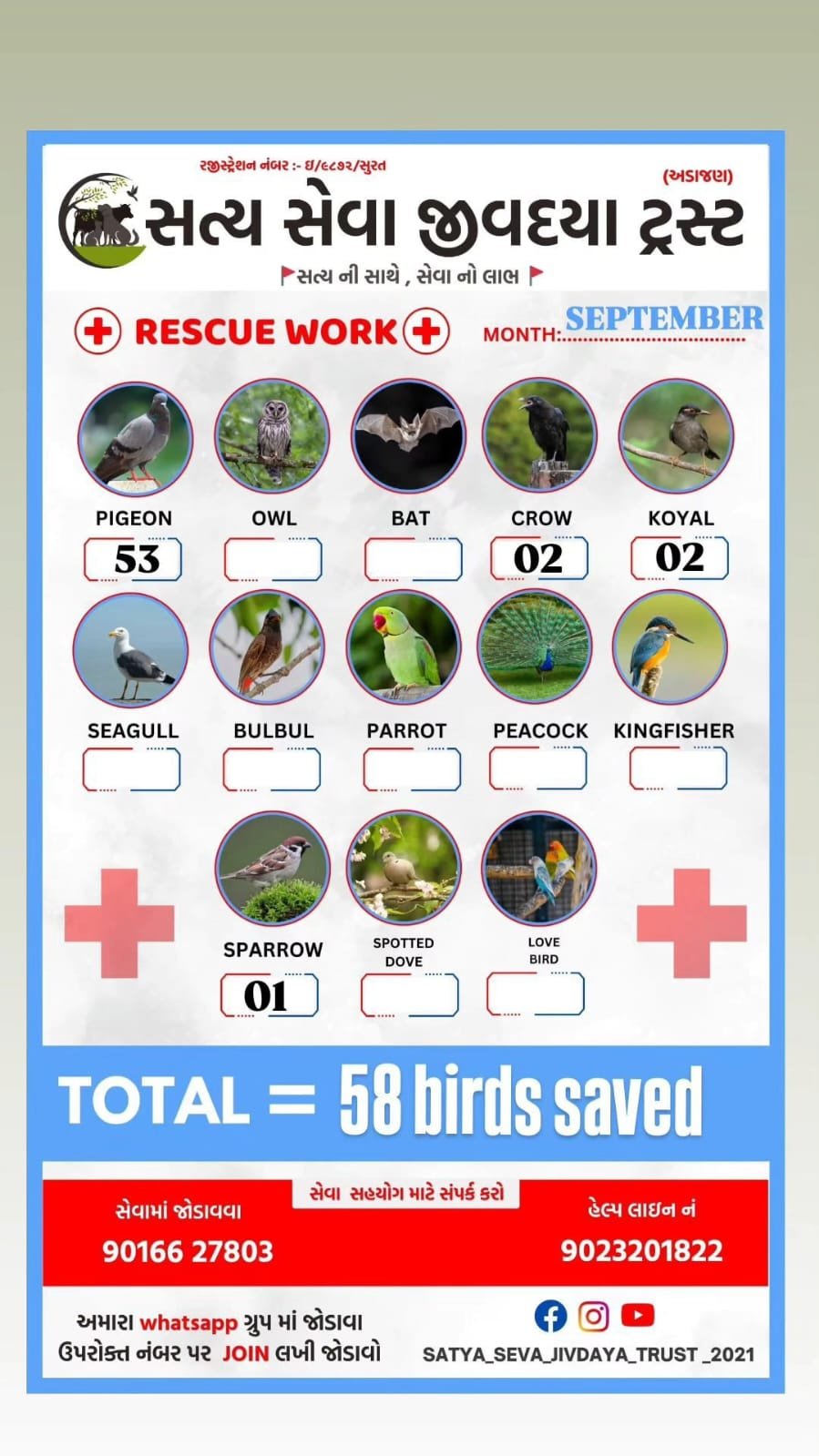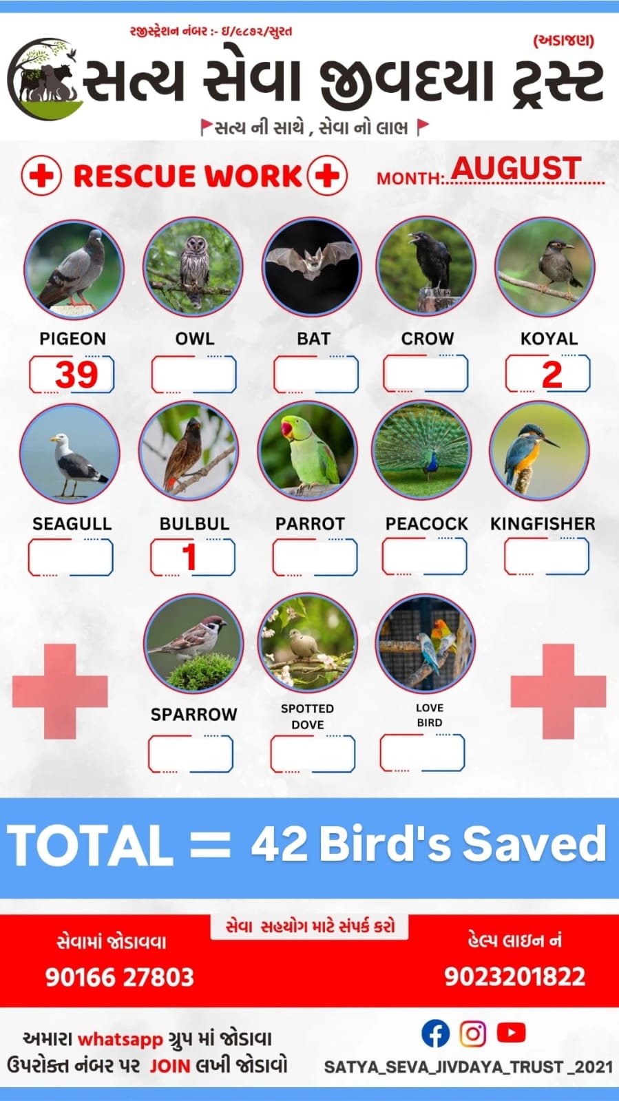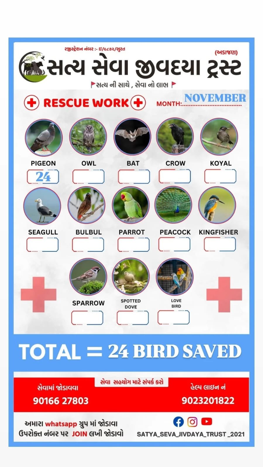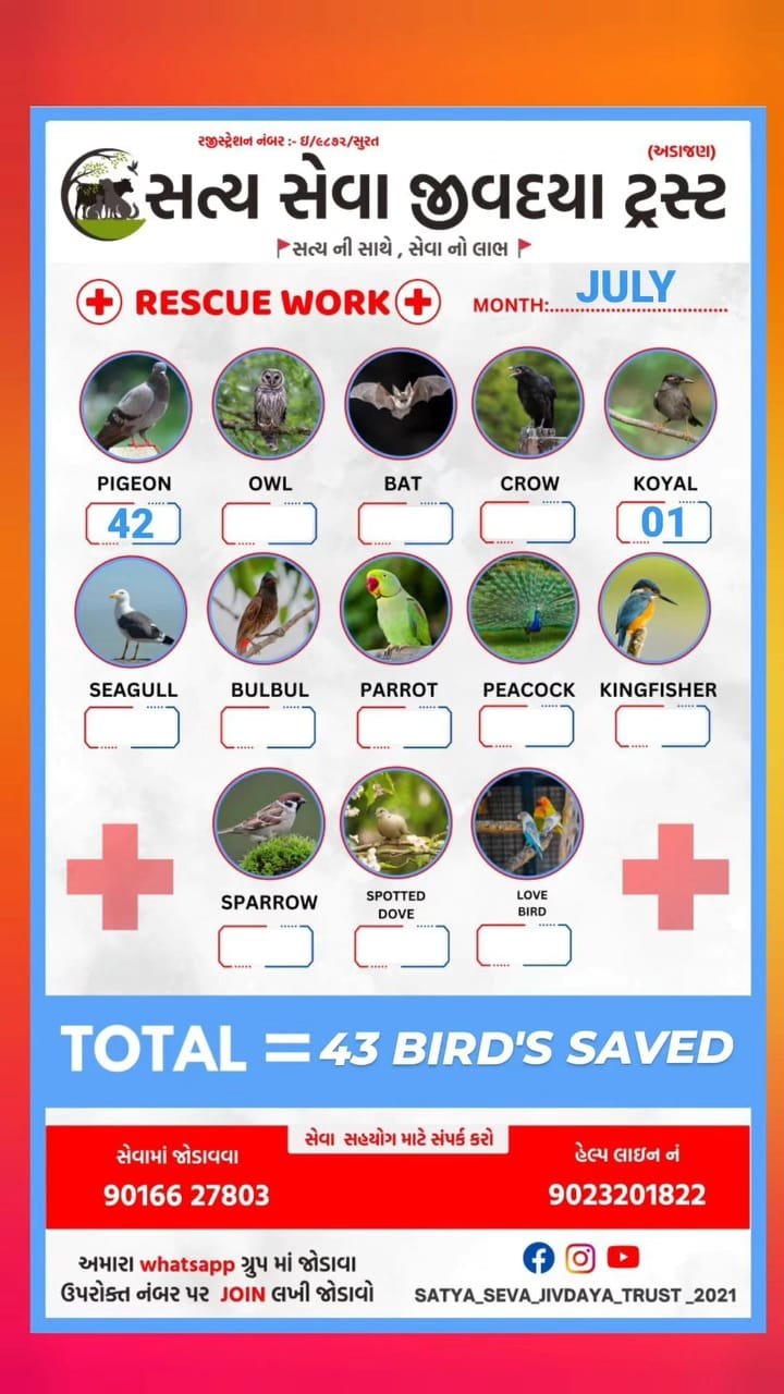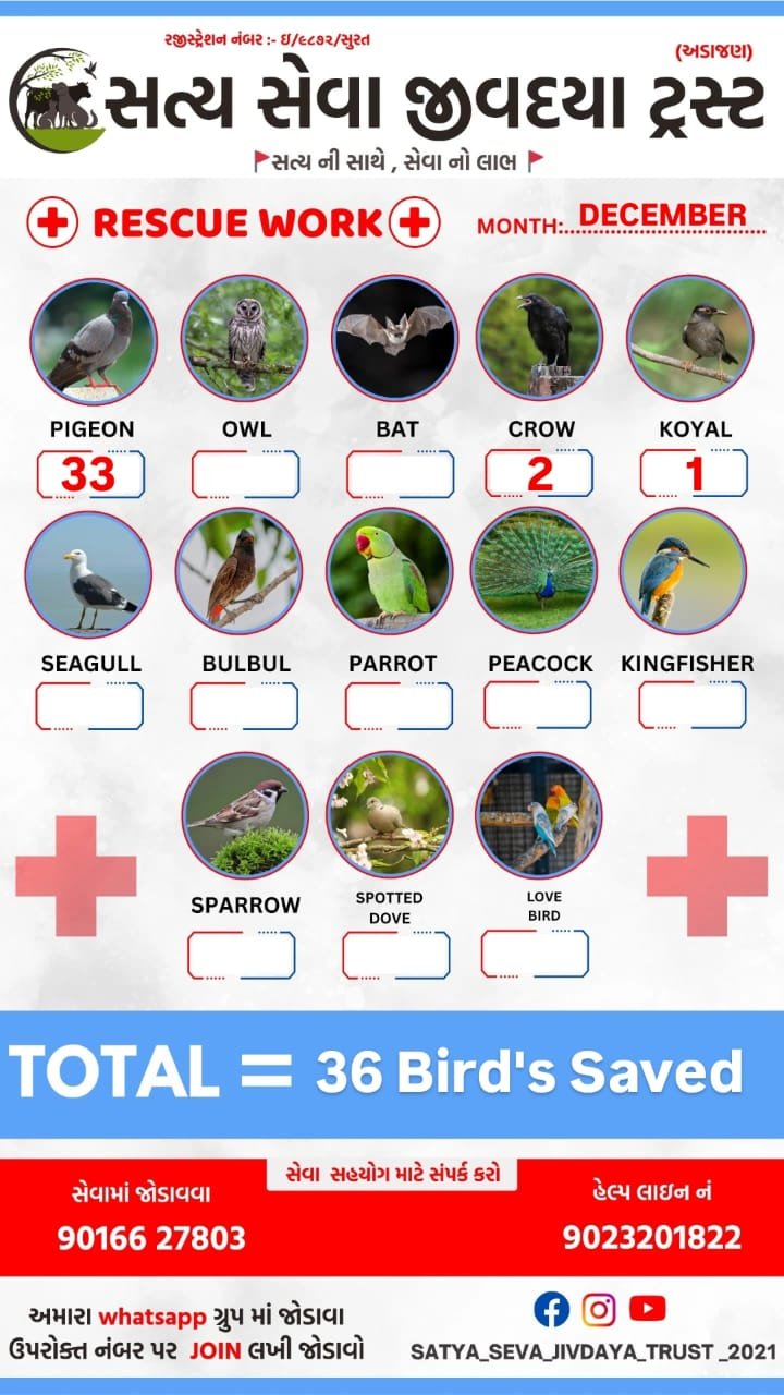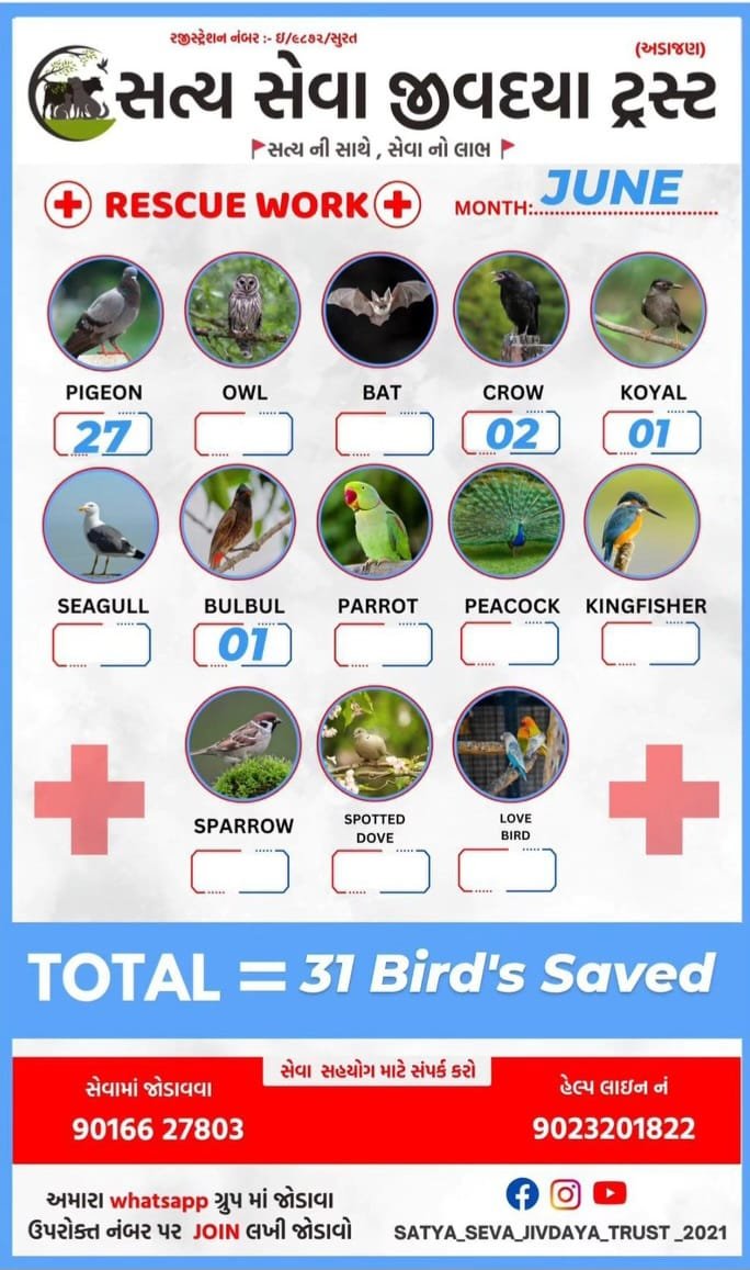 - ઘાયલ અને બીમાર પંખીડાંને બચાવવા માટે તાત્કાલિક સેવા આપવી.